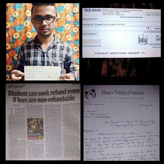 There is a Science Student called Mr.Saqib Sayed who would like to do Telecommunication Engineering and he paid the fees of Rs.1,06,405/- at Saboo Siddiqui College, Byculla, we went n we gave the mnava Vatslaya Foundation letter and along with it we attached News paper copy on the Refund policy. We followed up with college for almost 3 months and Today, finally student Saqib Sayed has got the Refund of Rs.1,06,405/- .